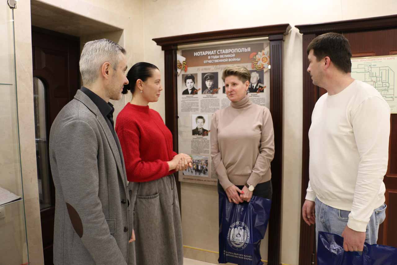 В нотариальную палату пришли инициаторы «Кадетского фронта» Екатерина Харламова и Максим Лесков. Их встретили член правления НПСК, член Совета и исполнительного комитета СРО АЮР, нотариус по Ставропольскому городскому нотариальному округу Иван Кашурин и член комиссии НПСК по культурно-патриотической и спортивной работе, нотариус по Шпаковскому районному нотариальному округу Диана Цупило.