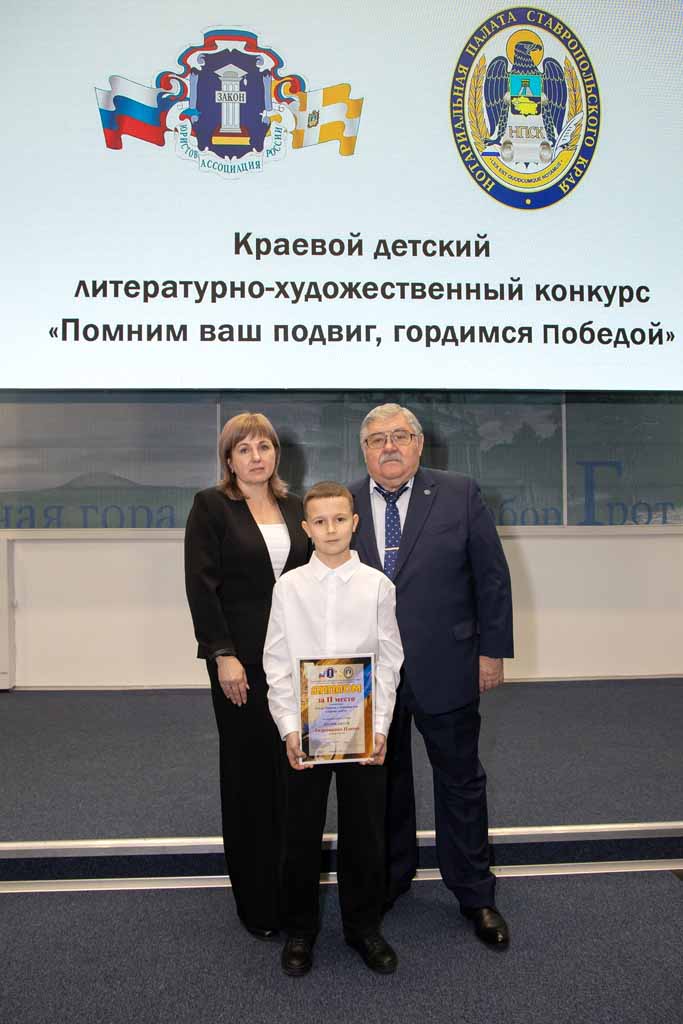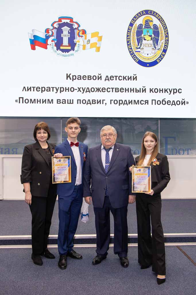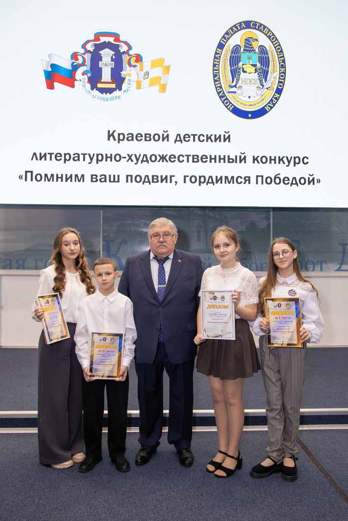 – С 2010 года мы проводим конкурсы для детей, – пояснил председатель Ставропольского регионального отделения Ассоциации юристов России, президент нотариальной палаты Ставрополья, депутат Думы Ставропольского края Николай Кашурин. – Идеей проведения первого проекта, который называется «Каждый имеет право…» являлось правовое просвещение детей и молодежи при помощи такого близкого для ребят средства самовыражения, как творчество. Дети в рисунках и литературных работах говорили о правах и обязанностях, Конституции Российской Федерации, борьбе с коррупцией и другом. На следующих этапах проведения этого конкурса к правовой тематике добавилась патриотическая, ведь формирование личности ребенка, настоящего гражданина своей страны начинается с любви к Отечеству – к родному дому и России в целом. В 2015 году патриотический конкурс для юных художников и литераторов оформился в отдельный проект – «Помним ваш подвиг, гордимся Победой!», поднимая не только тему малой и большой Родины, но и давая детям возможность рассказать о Великой Отечественной войне и ее ветеранах. А с учетом современных реалий конкурс включил в себя и находящую огромный отклик в сердцах детей тему о подвигах участников специальной военной операции. Мы искренне благодарны Правительству Ставропольского края и Фонду президентских грантов за поддержку проекта, который востребован, ожидаем ребятами и дает такие результаты.