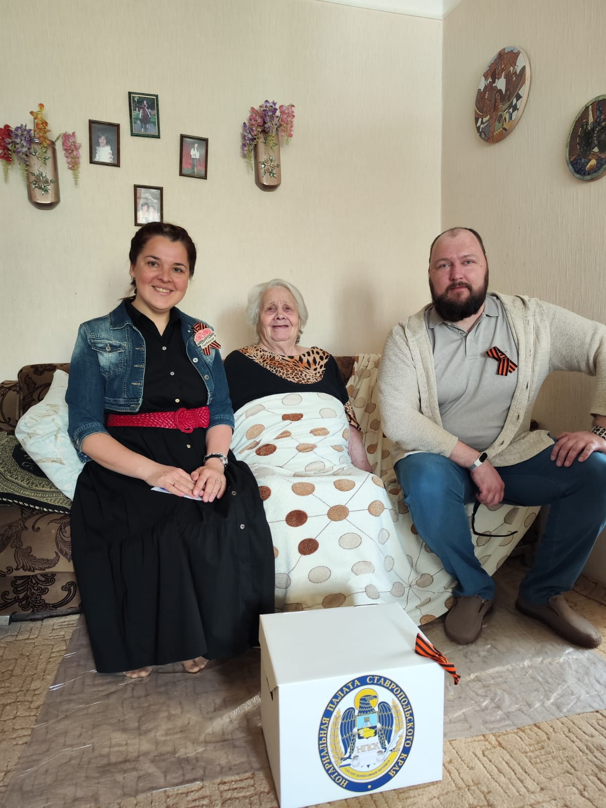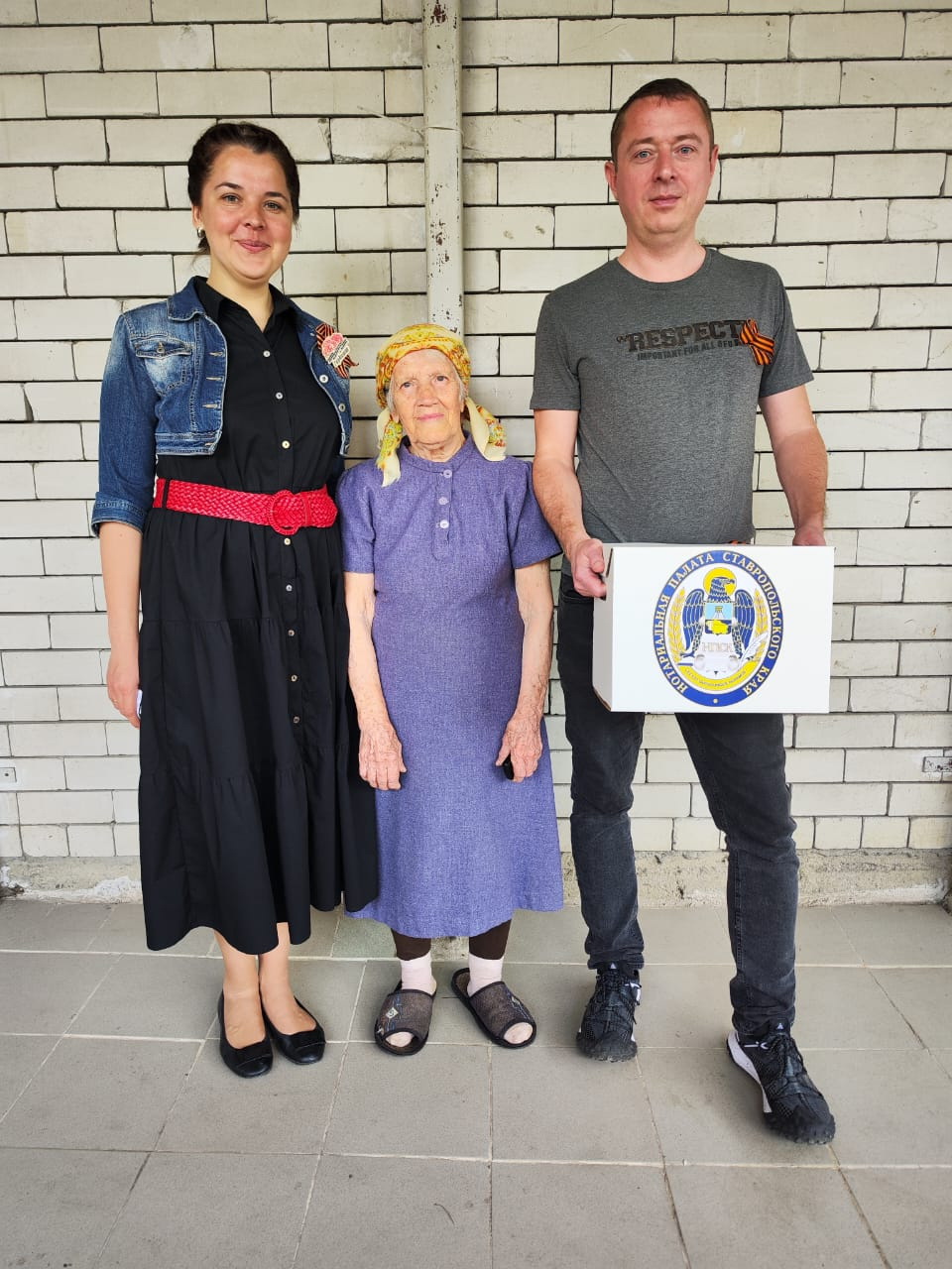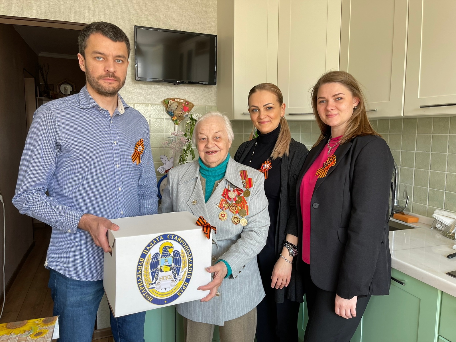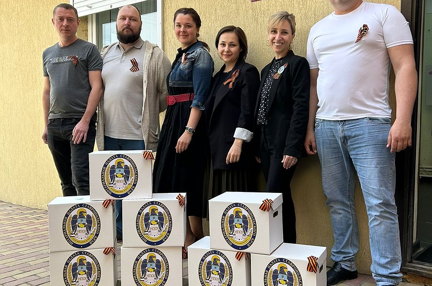 Были собраны гостинцы – продуктовые наборы и подарки для каждого в этом дорогом для нотариусов списке. Все это было уложено в коробки с символикой нотариальной палаты Ставрополья. На коробках закрепили Георгиевские ленты: